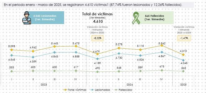 En el periodo enero-marzo de 2025, se registraron 4.610 víctimas (87,74% fueron lesionados y 12,26% fallecidos). Fuente: Agencia Nacional de Tránsito 2025.