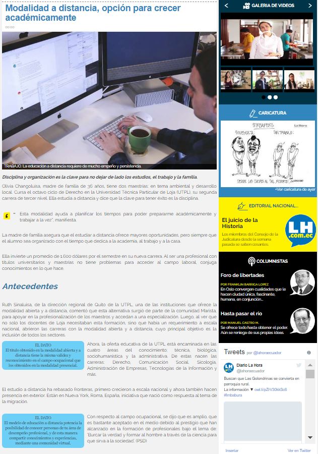 Diario La Hora en su edición web del lunes 4 de junio de 2018, publicó sobre la clave y oportunidades que ofrece el estudio a distancia. Aseguran que el título que se obtiene en esta modalidad cuenta con la misma validez y reconocimiento que los estudios presenciales.