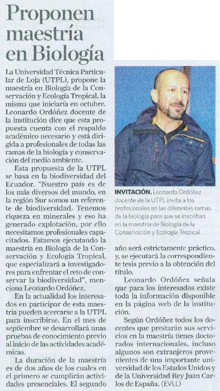 Diario La Hora en su edición del martes 3 de abril de 2018, publicó sobre la maestría en Biología de la Conservación y Ecología Tropical ofertada por la UTPL, que iniciará en octubre del presente.